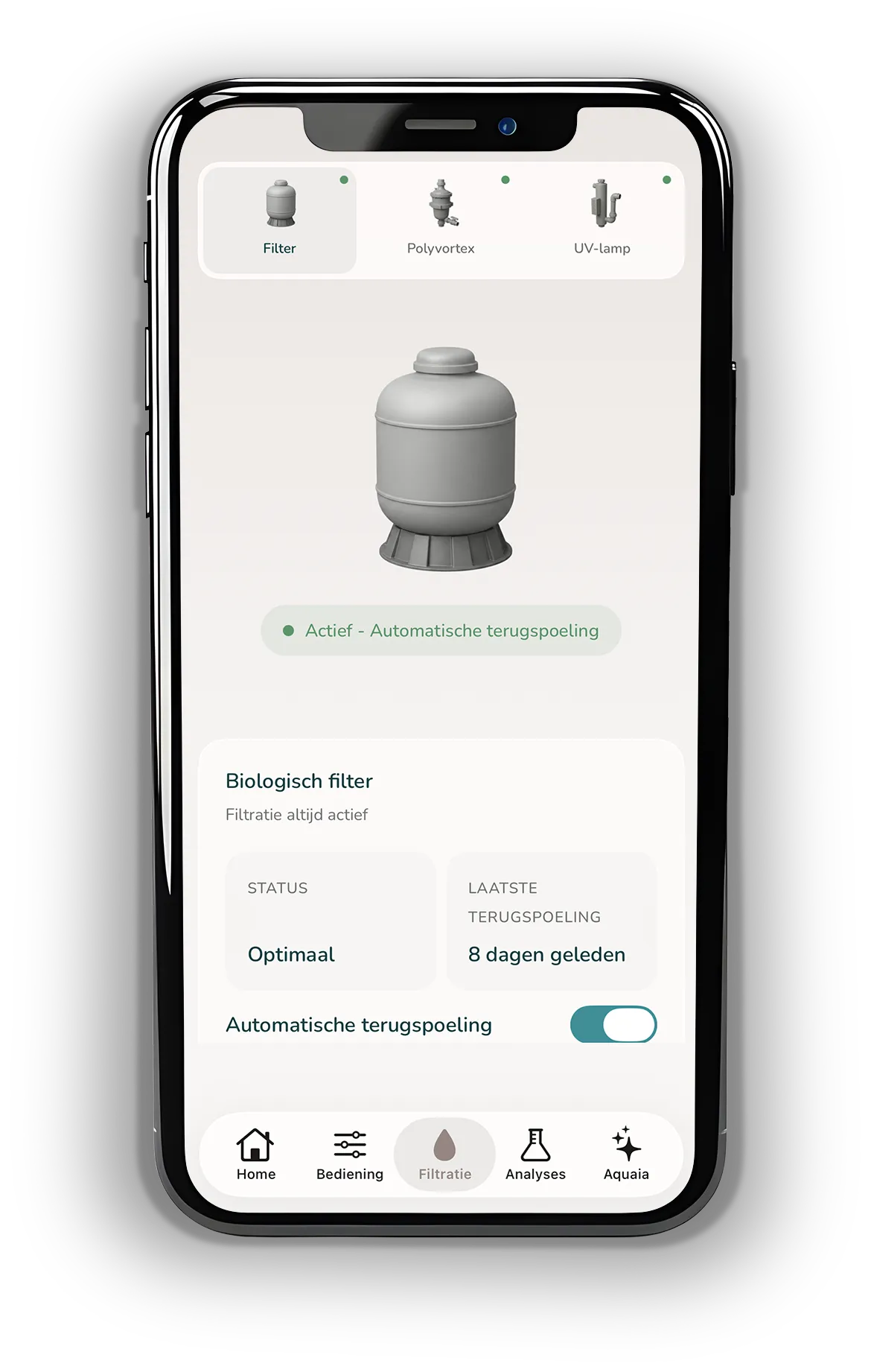 Hiermee kunt u de installatie monitoren, apparatuur (pomp, filter, terugspoeling) op afstand bedienen en de waterkwaliteit beheren via een smartphone, tablet of computer.